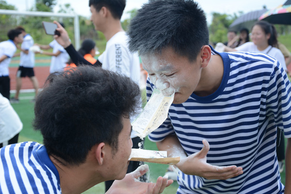 活动现场,同学们热情高涨,运动会精彩纷呈。在“扑面而来”项目中,每个同学咬着一张纸片传递面粉,由于传递时队友口中喘出的气使得面粉沾上了的同学的脸庞,惹来笑声朗朗。活动中最引人注目的要数国外院的留学生参赛队,理解游戏规则对他们而言是一项挑战,而与中国学生合作完成比赛更是不易,他们时而迷惑时而恍然大悟击掌称快,时而蓄势待发时而热情欢呼,成为全场亮点。