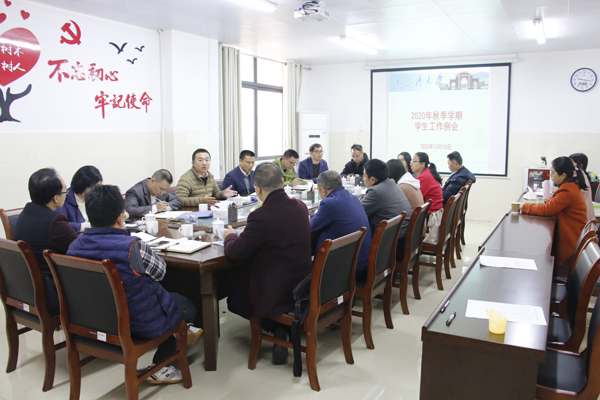 陈磊副校长在会上作讲话,对今后的学生工作提出十点要求:第一,抓好考风考纪教育,同步推进教风、考风、学风、校风建设;第二,抓好考研学生的备考保障和支撑,在复习备考及生活方面给予关心;第三,抓好2021届学生就业工作,高度重视这项民生工程与政治工程,早重视、早谋划、早启动、早推进、早见成效;第四,要抓好学生心理健康教育与管理工作,高度关注高关怀学生;第五,分管学生和教学工作领导要协同抓好学生的学业管理,注重教育引导,帮扶学业困难学生,对违反规定、不达到毕业条件的要依规处理;第六,加强校规校纪教育,注重学生日常文明行为养成,反对铺张浪费,加强安全教育;第七,抓好辅导员队伍建设,要在工作、思想、生活上关怀辅导员,要支持辅导员聚焦主业,鼓励辅导员追求上进,建立不合格辅导员退出机制;第八,疫情防控方面,绷紧弦,不松懈;第九,充分发挥党委副书记的作用,要聚焦学生工作主职主业,做到工作亲自联系、亲自推动、亲自谋划、亲自督促;第十,及早谋划来年的工作,学生工作规划制订要长短结合,日常工作要思考创新,将学生工作与人才培养和思想政治教育工作融合起来。