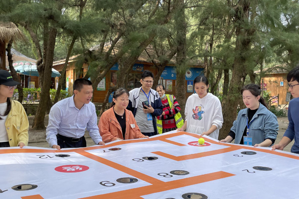 心理素质拓展活动是本次现场教育活动的压轴,参训人员分为4组进行数字漫游、珠行万里、搭桥过河三个项目的比拼,大家群策群力,团结协作,你追我赶,加油声此起彼伏,气氛热烈。活动培养了辅导员队伍的团队合作意识,展现良好精神面貌的同时,愉悦身心,传递了快乐。
