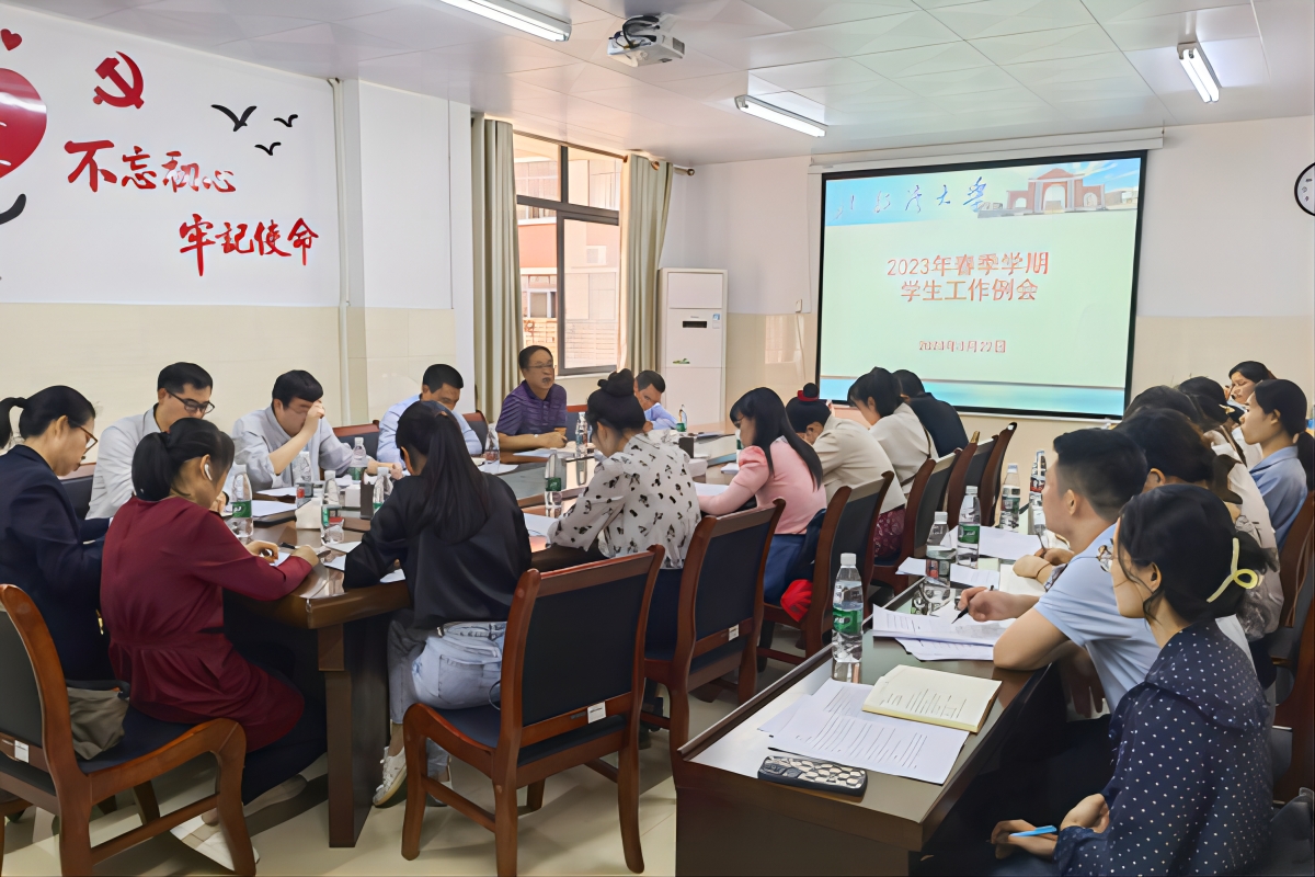 3月22日上午,学校在办公楼218会议室召开2023年春季学期第二次学生工作例会。学工部(处)、研工部、保卫处、后勤服务集团、各学院学工办主任或学工办负责人参加会议。会议由学工部(处)副部(处)长董海亮主持。