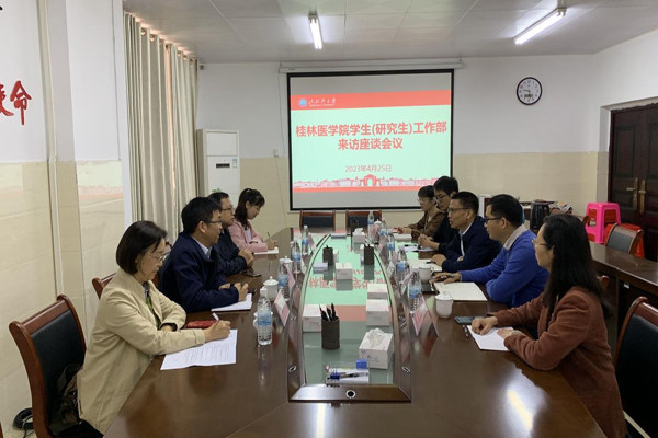 4月25日上午,桂林医学院学生(研究生)工作部部长龙亮一行到我校开展工作交流。学校学生(研究生)工作部部长裴以明热情接待了龙亮一行并召开座谈会。学工部(处)副部(处)长董海亮、心理健康教育中心主任程族桁、心理健康教育中心专职教师参加会议。会议由程族桁主持。
