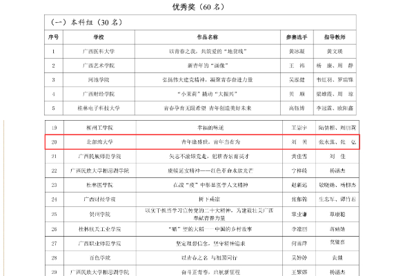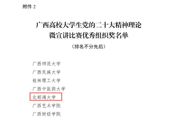 近日,由自治区党委教育工委、自治区教育厅主办,广西中医药大学承办的广西高校大学生党的二十大精神理论微宣讲比赛落下帷幕,据《自治区党委教育工委自治区教育厅关于公布广西高校大学生党的二十大精神理论微宣讲比赛获奖作品名单的通知》(桂教工委宣〔2023〕7号)获悉,我校荣获优秀组织奖,报送的五部作品中,《以文化之光,耀中华之路》、《传承红色精神,共圆复兴梦想》、《青年逢盛世,青年当有为》在大赛中获得佳绩,分别获得一等奖、二等奖、优秀奖。