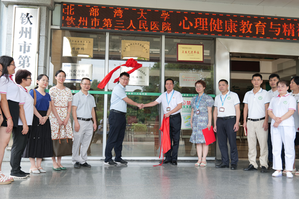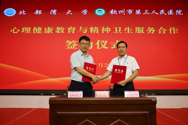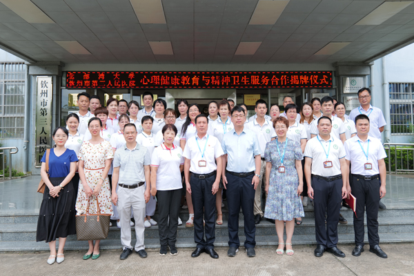 为了提升我校心理育人能力,从“就诊绿色通道、医师驻校评估、专家研判督导、身心健康培训、医教资源互助”五维共建,探索我校师生心理健康教育“医教结合”模式,2023年8月28日下午,我校与钦州市第三人民医院(钦州市精神病医院)在该院举行了“心理健康教育与精神卫生服务共建单位”签约和揭牌仪式。学校党校办副主任倪文豪,学生工作部(处)副部(处)长劳昌锦,大学生心理健康教育中心专职教师吴正慧、王洁莹,钦州市第三人民医院院长廖有兴及各科室负责人出席仪式。