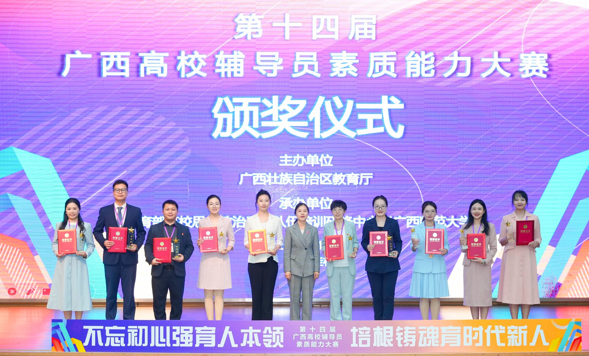 10月29日至31日,第十四届广西高校辅导员素质能力大赛在广西师范大学举行。我校海洋学院辅导员黄婧原、经济管理学院辅导员商双娇凭借扎实的专业功底和出色的现场表现,从参赛的全区86所高校的110余名选手中脱颖而出,分别以总分第4名和第19名的成绩,荣获大赛特等奖和一等奖,实现了我校在该项赛事中的历史性突破。
